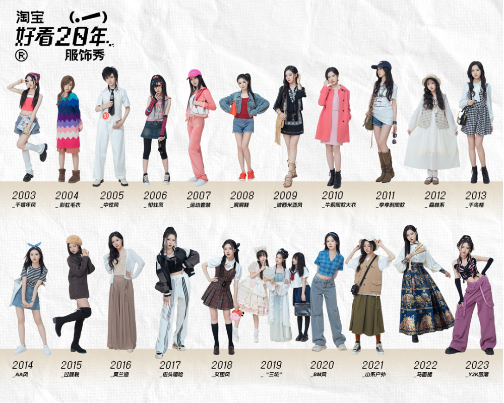 淘宝推出自2003年至2023年间的20套国民代表性造型这场秀是一部中国人的审美变迁史,是中国普通百姓追求“好看”的汩汩的渴望,是审美的成长,是从茫然到自信的,人的故事我们笨拙地学习,不怕失败、不怕嘲笑。