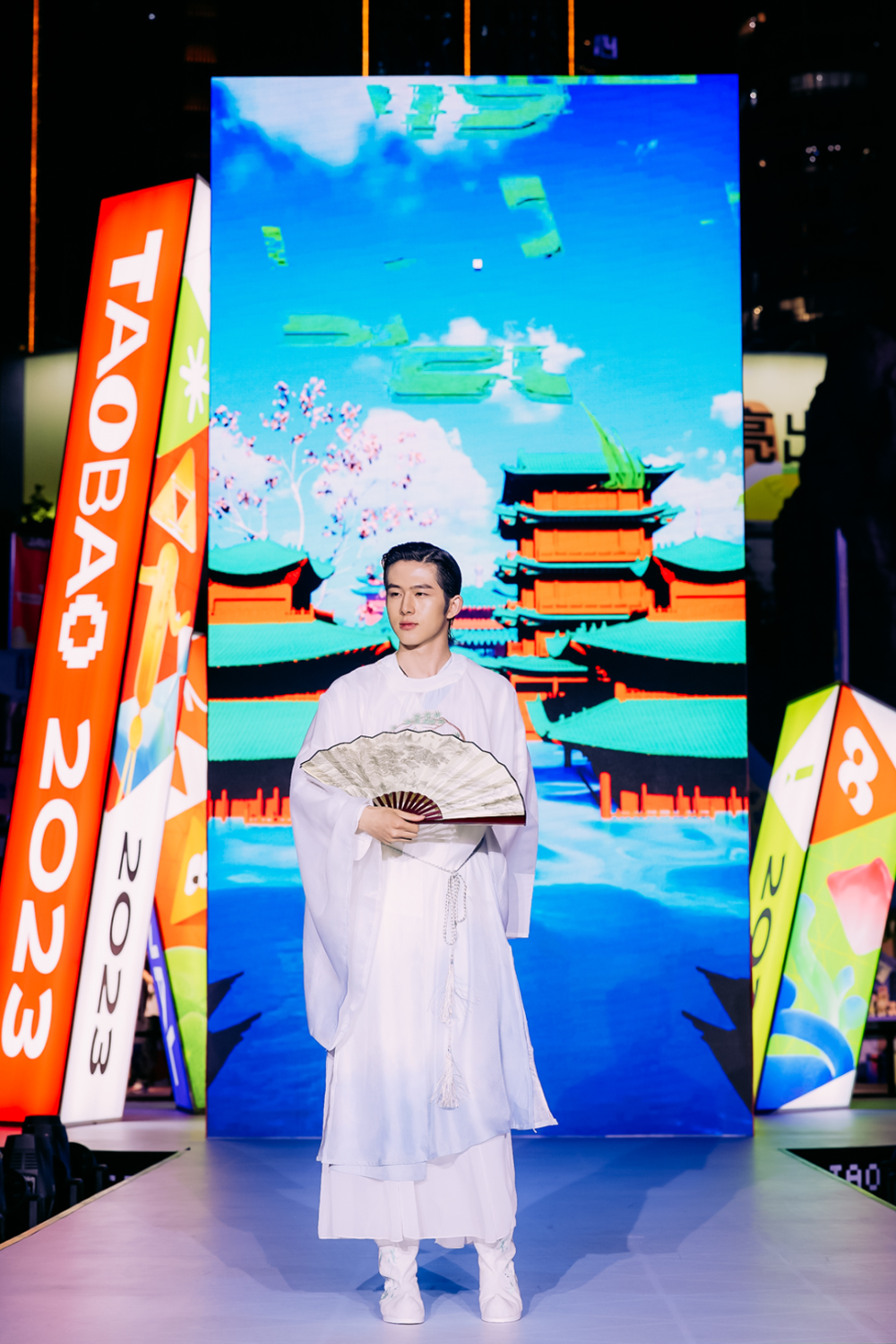 淘宝联合北京服装学院,年变为每一年选出一套代表性的服饰造型,最终成为这样一场秀,在几十分钟内飞快穿越时光隧道秀场大屏幕不断闪现霓虹色符号化的磁带、老式手机、3.5寸软盘,环绕广场周围的商场外壁巨大屏幕上,闪烁的是最新最热门的各种商品广告大片。