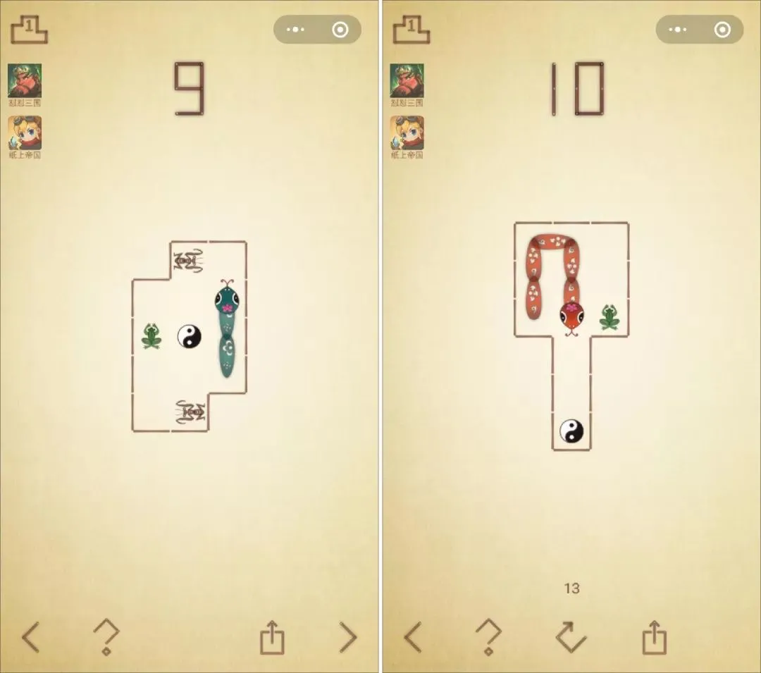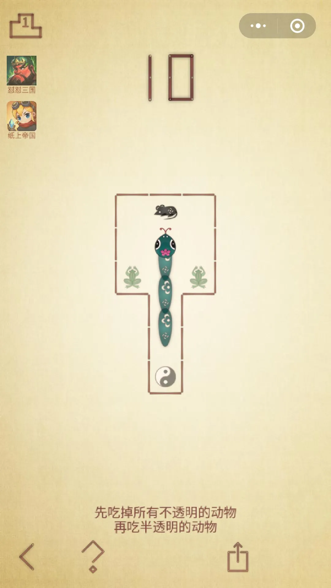 如果你实在遇到难关,还能透过下方的「问号」来获取提示,点击左右的方向也能迅速切换关卡「蛇它虫」并没有主页,进入即可进行格斗游戏,搭配上满满「中国风」的界面与片头曲,够经典之作该小程序未找到二维码,能直接去搜索小程序名称体验。