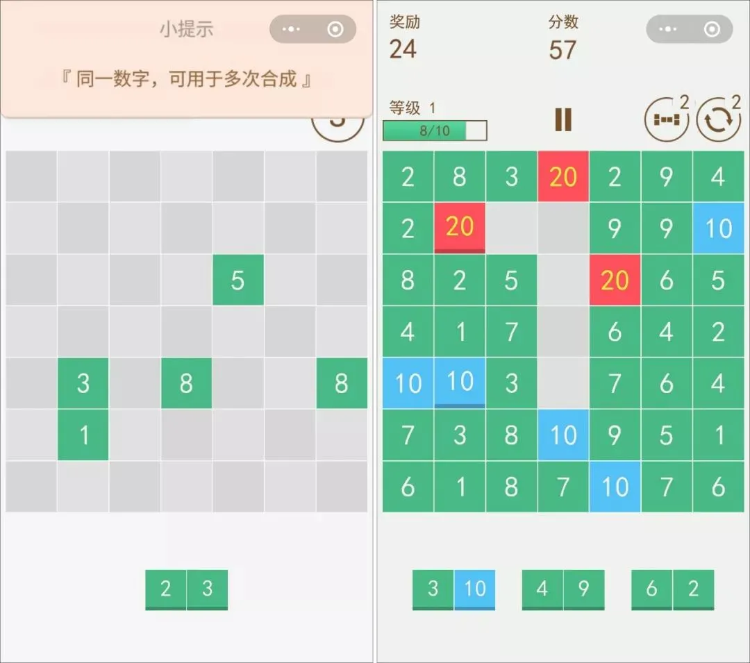 1020 是这款最近入选的创意迷你格斗游戏,听到这格斗游戏名字,你可能会感觉是这款类似「2048」的格斗游戏,但却并非如此在此款迷你格斗游戏中,你须要将相邻三个数字合并为 10 或 20,之后消除数字并得分听起来容易,但别忘了在右上角的「步数」,在下方会提供更多不同顺序摆放的数字,你须要将它们摆放开来。