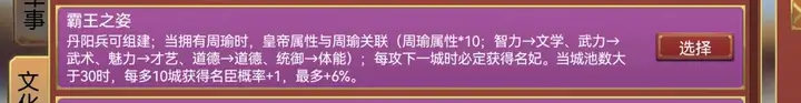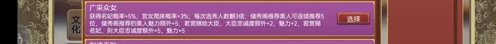 也是相当新颖的自为,不想在前期带周瑜浪费开国功臣位的话,能氪孔明的策卡君王属性基本第二局毕业,各项都在1000左右,能用所有的空闲去玩宫中了~除了每攻下一城就获得两个该文化区域名妃,满足用户你的收集欲和征服感,相比较而言加开国功臣率反倒没有那么显眼了~总之也是很新颖的自为!!。